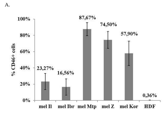 To better understand the mechanisms defining the sensitivity of the melanoma cells to MV, the surface expression level of MV receptor was measured. CD46 molecule being a receptor for attenuated strains of MV is known to be upregulated on the surface of tumor cells [13]. Therefore, the expression of CD46 on the surface of melanoma cells and HDF cell line was analyzed (Figure 6).