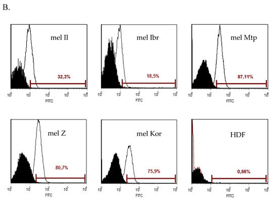 Expression of the CD46 receptor at the surface of melanoma cells and HDF as measured by flow cytometry. A total 1.0 × 105 cells were incubated with a FITC-conjugated anti-human CD46 antibodies in PBS containing 1.0% FBS for extracellular staining. After 30 min, cells were washed twice, resuspended in PBS and fixed with 1% PFA for 30 min. A. Plot of fluorescence intensity (relative to isotype) of cells stained with anti-CD46-FITC. The data shown are mean results from three separate experiments; error bars indicate standard deviation of the mean B. Representative histograms. The shaded histograms represent isotype control staining; the solid line histograms represent CD46 staining; OX—CD46 (FITC), OY—the number of cells.