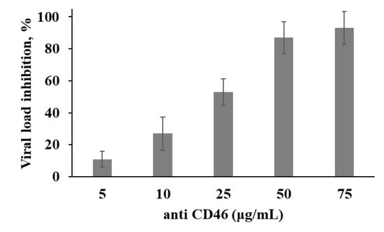 To confirm the role of CD46 molecule expression on the surface of our melanoma cells in viral oncolysis, the mel Z cells were infected with MV at a MOI of 1.0 again in the presence of anti-CD46 mAbs or isotype control mAbs and viral RNA expression was measured in cell lysates by qPCR-RT after 4 h of incubation (Figure 7). Mel Z cell line was chosen as being sensitive and permissive to MV and expressing high level of CD46 molecules, but in the presence of anti-CD46 mAbs viral yield, was inhibited by approximately 11%–91 % in a mAbs concentration-dependent manner (Figure 7). Thus, these data suggest that CD46 expression could be a key factor of MV selectivity to melanoma cells comparing with non-malignant cells; however, other factors should also be implicated into the different sensitivity of the melanoma cells as it cannot be explained only by different levels of CD46 expression.