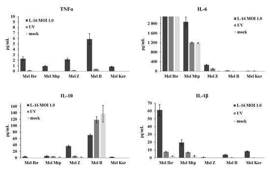 To investigate the ability of melanoma cells to produce an inflammatory response to MV infection, supernatants collected from cells infected with a MOI of 1.0 of MV were analyzed by ELISA for the presence of pro- and anti-inflammatory cytokines—TNFα, IL-1β, IL-6, IL-10 and IL-18 at different time points after infection (Figure 9). The release of cytokines varied between cell lines; however, all cell lines did not express IL-18 at a detectable level (data not shown) but expressed TNFα although at a low level. Uninfected and infected Mel Ibr cells overexpressed pro-inflammatory cytokine IL-6 higher than the detectable level. Mel Mtp cells also expressed Il-6 and increased its expression after MV infection. However, IL-6 can act also as anti-inflammatory agent interacting with TNFα and could potentially favor tumor progression. Both cell lines, mel Ibr and mel Mtp, also expressed the inflammasome formation mediator, IL-1β, at high level comparing with mel Kor and mel Il cell lines, while for mel Z cells the IL-1β expression was not detected. Infection with UV-inactivated MV also induced IL-1β release, although at a lower level comparing with intact MV infection. The separate release of IL-1β without IL-18 cytokine could indicate a non-canonical caspase activation distinct of caspase-1 activation. For two cell lines, mel Il and mel Z, significant expression of anti-inflammatory cytokine IL-10, known among all by regulating the NF-κB activity and Janus kinase-signal transducers and activators of the transcription (JAK-STAT) signaling pathway, was detected. However, in the mel Il cell line, the MV infection decreased release of IL-10 comparing with uninfected or infected with UV-inactivated MV cells. Thus, all human melanoma cells tested responded to the MV infection; however, as for the relative gene expression, no common pattern of cytokine expression was revealed.