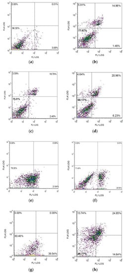 Cytometric analysis of apoptosis in infected melanoma cells stained with Annexin V/PI and analysed by flow cytometry. a. Uninfected mel Mtp cell line at 48 h incubation; b. MV infected mel Mtp cell line at 24 h post infection; c. MV-infected mel Mtp cell line at 48 h post infection; d. MV infected mel Mtp cell line at 72 h post infection. e. uninfected mel Z cell line at 72 h incubation; f. MV infected mel Z cell line at 72 h post infection; g. mel Ibr cell line at 72 h incubation; h. MV infected mel Ibr cell line at 72 h post infection. ОХ—Annexin V (FITC), OY—PI.