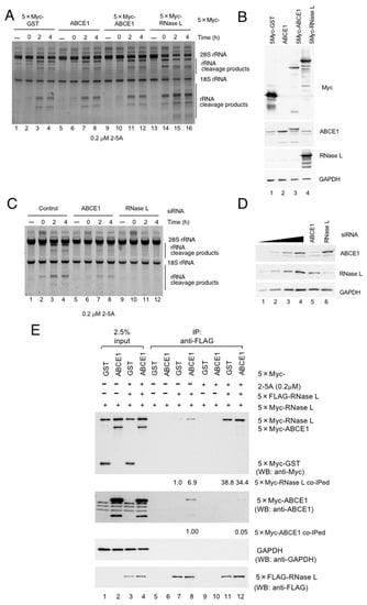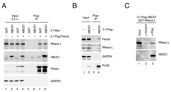 Antibodies used for western blotting were as follows: anti-Pelota (raised against His-tagged Pelota(220-385)) [], anti-RNase L (raised against His-tagged RNase L(1-333)) [], anti-GAPDH (raised against His-tagged GAPDH) [], anti-ABCE1 (raised against His-tagged ABCE1), anti-Flag (Sigma-Aldrich, MO, USA, F3165, Cell Signaling Technology, 2368, Danvers, MA, USA, 2368) and anti-Myc (Sigma-Aldrich, St. Louis, MO, USA, 11667149001, Santa Cruz Biotechnology, sc-789, Dallas, TX, USA, sc-789).