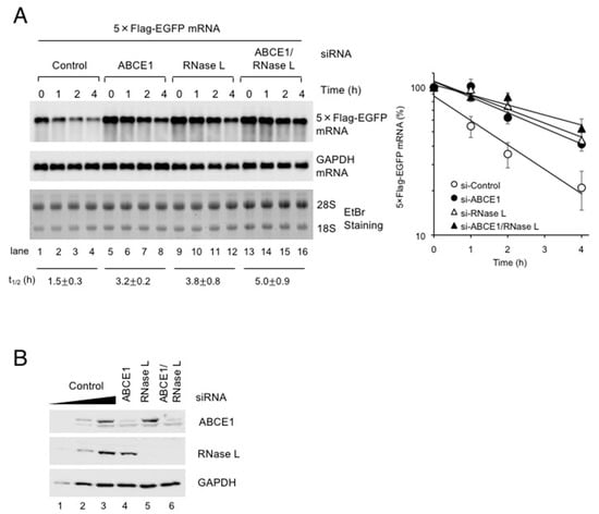 The decay rate of exogenous RNA was calculated as described previously []. HeLa cells were transfected with siRNA to downregulate the specified proteins. Forty-eight hours after siRNA-transfection, the cells were further transfected with 5×Flag-EGFP mRNA for 1 h, and then the cells were washed with phosphate-buffered saline to completely shut off supply of 5×Flag-EGFP mRNA. Subsequently, the cells were harvested at the specified time after PBS wash. Total RNA was isolated from the transfected cells using an acid guanidinium thiocyanate-phenol-chloroform extraction method and analyzed by northern blotting using DIG-labeled RNAs as described previously with minor modifications []. Total RNA was resolved in a 1.8% agarose/1×MOPS/2% formaldehyde gel. After overnight capillary transfer to a membrane in 20×SSC, the membrane was UV-crosslinked, prehybridized in DIG Easy Hyb (Sigma-Aldrich, St. Louis, MO, USA) at 68 °C for 1 h and then hybridized with DIG-labeled RNA probes diluted in DIG Easy Hyb (Sigma-Aldrich, St. Louis, MO, USA) at 68 °C overnight. The membrane was washed twice with 2×SSC/0.1% SDS for 5 min at r.t., twice with 0.1×SSC/0.1% SDS for 20 min and 15 min at 68 °C, and once with 1×Washing buffer (Sigma-Aldrich, St. Louis, MO, USA) for 2 min at r.t. The membrane was then blocked with 1% blocking/ 1×Maleic acid buffer (Sigma-Aldrich, St. Louis, MO, USA) for 1 h, followed by incubation in anti-DIG (1:20,000) (Sigma-Aldrich, St. Louis, MO, USA)/1% blocking/1×Maleic acid buffer for 30 min. The membrane was washed twice with 1×Washing buffer for 15 min at r.t., and then equilibrated in 1×Detection buffer (Sigma-Aldrich, St. Louis, MO, USA) for 5 min. The signals were developed using CDP-Star (Sigma-Aldrich, St. Louis, MO, USA).