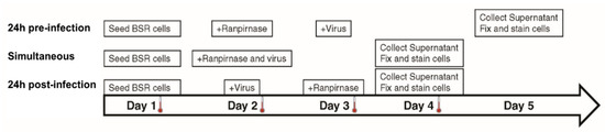 −8.54 mM) in 10-fold serial dilutions to each well in 24 h postinfection treatment slides, and RABV ERA was added at MOI = 0.1 to each well in 24 h preinfection treatment slides. The 24 h preinfection treatment slides were incubated for 48 h and 24 h and postinfection treatment slides were incubated 24 h at 37 °C and 0.5% CO
