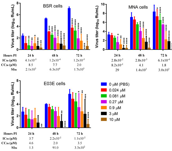 50. The selective index was lower in the primary cell line E03E indicating that effects on the host cell may have contributed to RABV inhibition (