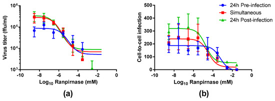 −6.54 mM). Otherwise, no other significant differences were observed, in that virus titer decreased similarly between all groups with increasing concentrations of ranpirnase TMR-001. The IC