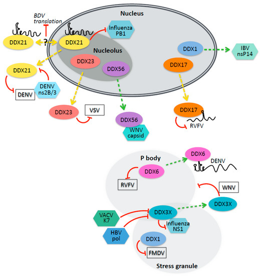 DEAD-box helicases with diverse cellular roles and localization interact with viral components and influence infection. DEAD-box helicases residing in nuclear, p-body, and stress granule compartments, have been implicated in viral infection. Interactions involve viral proteins, viral RNAs, or remain undefined. DEAD-box helicases can have positive or negative effects on infection. In some cases, viruses have been shown to counteract antiviral helicases, to alter the localization of helicases, or to disrupt RNA-protein (RNP) complexes. The red lines indicate negative interactions; the green arrows indicate positive interactions; and the dotted lines indicate protein relocalization. (VSV, vesicular stomatitis virus; DENV, dengue virus; RVFV, Rift Valley fever virus; WNV, West Nile virus; BDV, Borna disease virus; IBV, infections bronchitis virus, FMDV, foot and mouth disease virus; HBV, hepatitis B virus; VACV, vaccinia virus).