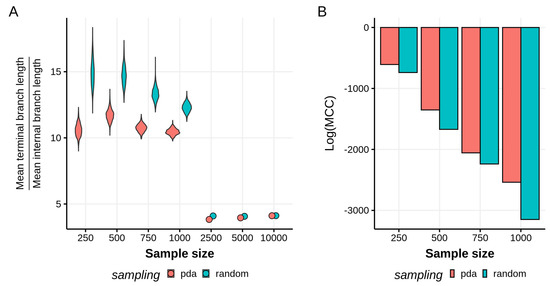 Moreover, the variance of the branch ratio distributions is larger in the randomly sampled datasets, implying a higher uncertainty in the branch lengths reconstructed, but not necessarily saying anything on the variability in topology. A formal way to examine this variability in topologies is by comparing the maximum clade credibility (MCC) scores of each tree distribution. We used TreeAnnotator to find the highest log clade credibility score—the log product of posterior probability support values for each node in the maximum clade credibility tree—and tree for each distribution (Figure 1B). For all sample sizes, the datasets sampled with PDA are associated with higher log(MCC) scores, which reflects less uncertainty and a more constrained set of topologies in the tree distribution.