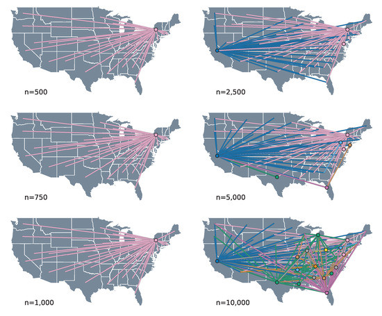 The connectivity plots show that this source–sink pattern is most pronounced in the smaller subsample sizes—up to 1000 taxa for random subsampling (Figure 2) and 750 for PDA (see Supplementary Materials)—where the geographic reconstructions show all transitions originating from the state of New York to other states. As the number of sequences grows beyond these subsample sizes, the source–sink dynamics remain, but with the number of sources increasing to include the states of California and occasionally Florida and Texas. Interestingly, for the randomly subsampled 10,000 taxa dataset, we see a considerable increase in the connectivity of the spatial process, with transitions originating from over 15 different locations.
