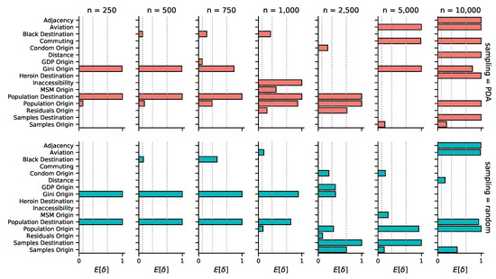 Predictors of HIV-1B spatial spread within the United States by subsample size and sampling scheme (PDA/random). Posterior inclusion probabilities for each predictor are represented in terms of indicator expectations (). Only predictors with a Bayes factor greater than 5 in at least one analysis are displayed. Dotted vertical lines denote inclusion probabilities corresponding to Bayes factors of 5, 25, and 100, respectively. For all inclusion probabilities and a description of each predictor, we refer to Supplementary Materials Figures S5 and S6.