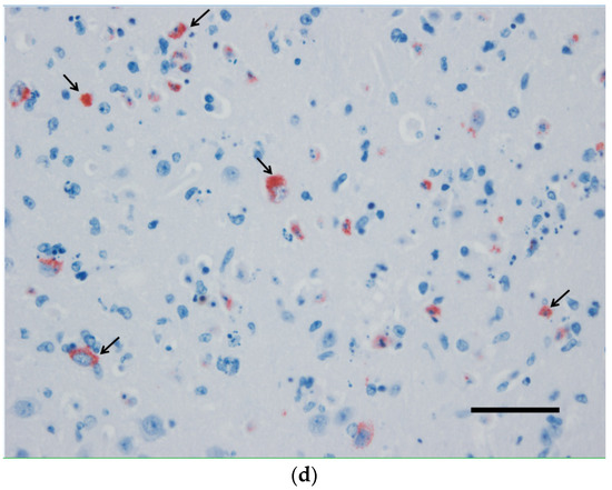The brain of a wild-type 129/Sv mouse injected with the Usutu virus via the intradermal route. Massive neuronal death demonstrated by karyorrhexis and karyolysis (a,b) in correlation with intense immunohistochemical labeling of USUV antigens (c,d). (a,b) Hematoxylin and eosin staining, (b,c) hematoxylin counterstain. Scale bars a and c = 200 µm, magnification 100×; Scale bars b and d = 50 µm; magnification 200×.