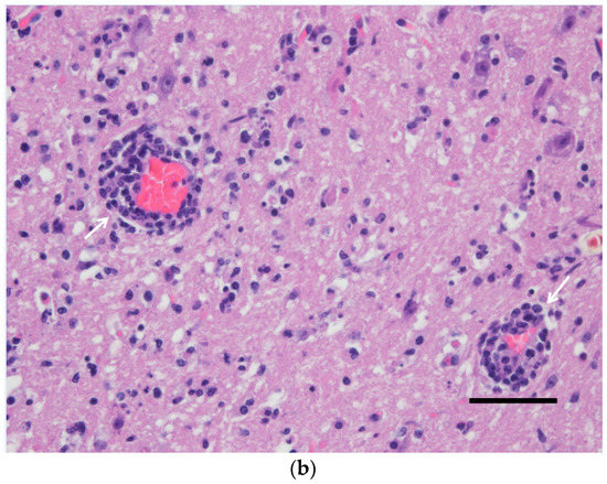Spinal cord (gray matter) of a wild-type 129/Sv mouse injected with the Usutu virus via the intradermal route. Abundant neuronal death with neuronophagia and moderate satellitosis and gliosis (a) and lymphoplasmacytic perivascular cuffs (b). Hematoxylin and eosin staining. Scale bars = 50 µm, magnification 200×.