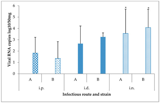 Viral RNA loads measured by RT-qPCR in brain samples (n = 6 per condition) collected from mice 15 days after their challenge with the Usutu virus via different routes. * p-value < 0.05. A: USU-BE-Seraing/2017, B: USU-BE-Grivegnee/2017, i.d.: intradermal, i.n.: intranasal, i.p.: intraperitoneal.