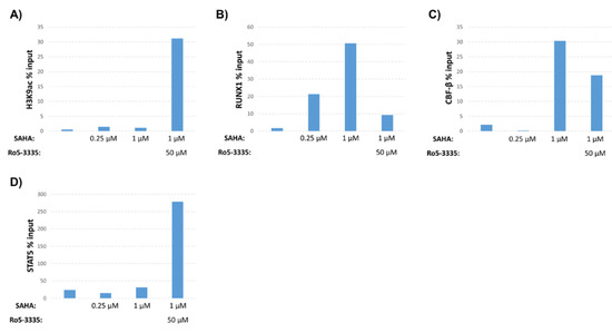 Effect of suberanilohydroxamic acid (SAHA) and Ro5-3335 treatment on the human immunodeficiency virus type 1 (HIV-1) long terminal repeat (LTR). TZMbl cells were cultured for 48 h in medium containing indicated concentrations of SAHA in the presence or absence of 50μM of Ro5-3335. Cells were harvested for chromatin immunoprecipitation (ChIP) using antibodies against (A) histone H3 acetylated at lysine 9 (H3K9ac), (B) RUNX1, (C) core binding factor-β (CBF-β) or (D) STAT5.