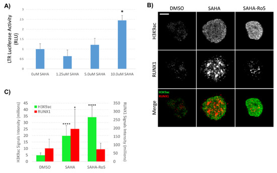 Effect of SAHA and Ro5-3335 treatment on RUNX1 expression in the nucleus. (A) LTR-driven luciferase activity was determined post-treatment with the indicated concentrations of SAHA; (B) nuclei were isolated from TZMbl cells treated with 1µM SAHA and 50µM Ro5-3335 and stained for H3K9ac (green) and RUNX1 (red). Spinning disk confocal microscopy was used for imaging using 100X oil objective. Images of bright field and nuclear fluorescence were captured using a high-speed camera. (C) Localize software was used to measure signal intensity in the collected images. Scale bars: 5 μm. * P ≤ 0.05, *** P ≤ 0.001.
