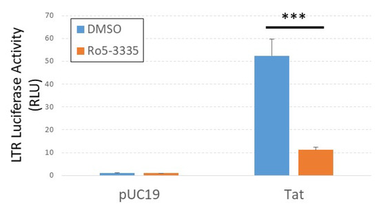 The benzodiazepine Ro5-3335 was described ~20 years ago to be an inhibitor of HIV-1 Tat activity [37]. A small clinical trial of its analog, Ro24-7429, determined it not to be an effective intervention for acute infection [38]. Work by the Liu group identified the RUNX suppressive activity of Ro5-3335 and showed that the drug interacted with the HIV-1 Tat protein [17]. We were curious if Ro5-3335 would suppress Tat transactivation in our system. For these studies, we transfected TZMbl cells in 96-well format with a plasmid encoding HIV-1 Tat, treated 24 h later with or without Ro5-3335 and then determined luciferase activity 24 h after treatment (Figure 3). As expected, Ro5-3335 significantly suppressed LTR-driven luciferase expression in keeping with its description as a Tat inhibitor.