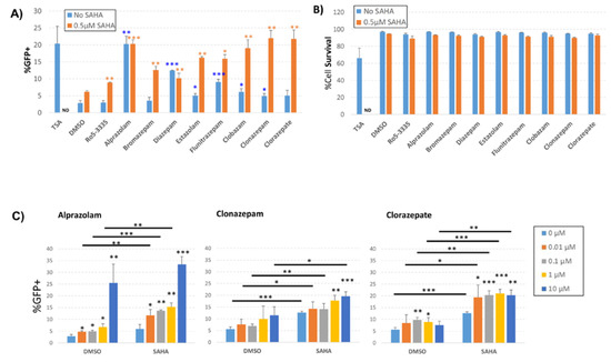 We next sought to determine if other BDZ compounds might be able to more potently activate HIV-1 transcription while avoiding Tat suppression. BDZs have been used for many decades for controlling anxiety, depression, convulsion and sleeping disorders [39,40,41]. This means that a large number of well characterized compounds exist. We chose eight of the FDA approved BDZs to screen for the ability to activate the HIV-1 LTR (Table 1). For screening we used the J-Lat 10.6 T-cell line containing an integrated HIV-1 provirus (single cycle) that encodes GFP. Transcriptional activation was measured by flow cytometry as the percentage of GFP+ live cells 48 h following treatment with 10 µM BDZs; TSA, a non-specific inhibitor of class I and II HDACs, was used as a positive control for activation (Figure 4A). Treatment with DMSO showed only a background level of GFP+ cells (2.8%). Similarly, Ro5-3335 alone did not significantly activate transcription above background (3.0%). Of all of the BDZs tested, Alprazolam and Diazepam treatment resulted in significant activation of the LTR compared to the DMSO control (20.3% and 12.4% respectively); the remainder of the BDZs induced small, but occasionally statistically significant changes in the percentage of GFP+ cells. Treatment of J-Lat 10.6 cells with 0.5 µM SAHA induced a minor increase in GFP+ cells compared to the DMSO control (6.2%). When cells were treated with BDZs in combination with SAHA, we observed a significant increase in GFP+ cells compared to SAHA alone. We also observed an increase in LTR activation in cells treated with BDZs and SAHA compared to cells treated with BDZs alone with the exception of Alprazolam and Diazepam which already showed maximum activation of the assay in the absence SAHA. Cell viability of cells from Figure 4A was determined 48 h after treatment; cells were harvested and stained with Live/Dead staining according to the manufacturer’s protocol and measured by flow cytometry as the percentage of live cells (Figure 4B). TSA induced significant toxicity (68% viable) whereas 0.5 μM SAHA resulted in only a slight reduction in viability compared to DMSO control. No significant loss of viability was measured in the presence of BDZs and treatment with SAHA and BDZs showed no decrease in viability beyond SAHA alone.