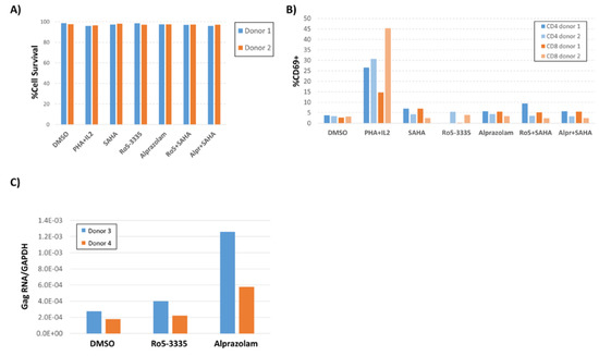 To investigate whether Alprazolam is specifically activating the HIV-1 promoter or having a general effect on T cell activation, primary peripheral blood mononuclear cells (PBMCs) from two healthy donors were treated with 10 μM alprazolam or 50 μM Ro5-3335 alone or in combination with 0.5 μM SAHA. At 24 h after treatment, cells were stained using Zombie Yellow Live/Dead stain, then stained for CD3, CD4, CD8, HLA-DR, CCR5, intracellular Ki67, and the early T-cell activation marker CD69, and then fixed for analysis by flow cytometry (Figure 5A,B; Figure S2). Anti CD3/CD28 (data not shown) and IL2/phytohaemagglutinin (PHA) treatment were included as a positive control for T-cell activation. These treatments did not cause an appreciable loss of cell viability (Figure 5A) and Alprazolam treatment in combination with SAHA did not appreciably increase T cell activation (Figure 5B). Examination of intracellular Ki67, CCR5 and HLA-DR revealed that neither SAHA, Alprazolam, nor a combination of the two induced an upregulation of these activation markers (Figure S2).