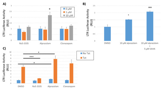 To confirm the observed effect of Alprazolam activation of HIV-1 LTR transcription in a minimal system and to determine the effect on Tat-activated transcription we again employed the TZMbl cell line. TZMbl cells were treated with Ro5-3335, Alprazolam or Clonazepam in the presence or absence of SAHA (Figure 6A,B) and LTR-driven luciferase activity was determined at 48 h post treatment. Alprazolam (10 μM) alone was capable of significantly inducing transcription from the LTR and the addition of SAHA further increased activation (Figure 6B). To reinforce the specificity of Alprazolam treatment on Tat activated transcription we transfected TZMbl cells in 96-well format with a plasmid encoding HIV-1 Tat, treated 24 h later with Ro5-335, Alprazolam, or Clonazepam and then determined activation by luciferase assay 24 h post treatment (Figure 6C). As expected, Ro5-3335 significantly suppressed Tat transactivation compared to the DMSO control. Alprazolam and Clonazepam did not exhibit an inhibition of Tat-mediated activation of the LTR. These data suggest that the mechanism of action of activation of the LTR by Alprazolam is distinct from that of Tat. Alprazolam does not act as an inhibitor of Tat, differing significantly from Ro5-3335.