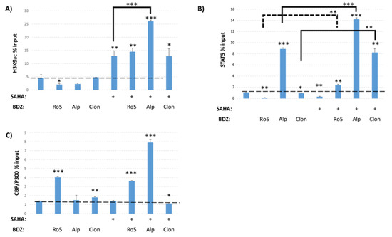 In order to elucidate the mechanistic differences between Ro5-3335 or Clonazepam and Alprazolam we performed ChIP assays to compare the effect of the two BDZs on the chromatin structure of the HIV-1 LTR. We limited our search to RUNX1 related factors and the H3K9 acetylation mark. ChIP analyses (Figure 7A), showed that BDZs do not affect acetylation by themselves. Alprazolam, but not Ro5-3335 or Clonazepam, was able to recruit STAT5 by itself. Recruitment of CBP/P300 by STAT5 and subsequent acetylation of H3K27 may explain the functional difference between these BDZs (Figure 8). Alprazolam also potentiated SAHA’s ability to drive H3K9ac occupancy at the HIV-1 LTR. This suggests that these BDZs may have an indirect effect on acetylation of H3K9. One of these may be the inhibition of RUNX1, which recruits HDACs to silence some genes. RUNX1 is also involved in recruiting polycomb repressive complex 1 (PRC1) in megakaryocytes and lymphocytes [54], which has been shown to be overexpressed in HIV-1 latent cell models [55]. PRC1 can recruit polycomb repressive complex 2 (PRC2) [56], a methyltransferase that targets H3K27 for mono-, di-, and tri- methylation. H3K27 is highly methylated in silenced HIV-1 chromatin [57]. H3K27 demethylation has been shown to augment the ability of SAHA to activate the latent reservoir [58]. Further work must be done to identify what effect BDZs may have on H3K27 and how they function in the presence of other transcriptional activators.
