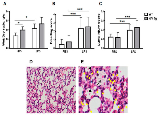 Intraperitoneal lipopolysaccharides (LPS) injections induce similar lung injury in WT and HIV-Tg mice at 6 h post administration. (A). Wet-to-dry ratios of lung tissue, (B) lung hemorrhage score and (C) lung injury score in wild-type (WT) and human immunodeficiency virus 1 transgenic (HIV-Tg) mice at 6 h after administration of either PBS or LPS. Mean and standard error are shown. Asterisks indicate: * p < 0.05 and *** p < 0.001. (D,E) Representative images of lung sections from HIV-Tg mouse injected with LPS and stained with hematoxylin and eosin. Original magnifications 100× (D) and 400× (E). Interstitial infiltrated neutrophils are indicated by yellow arrowheads; capillary microtrombi formation is indicated by black arrow; and hemorrhage is indicated by black arrowhead.