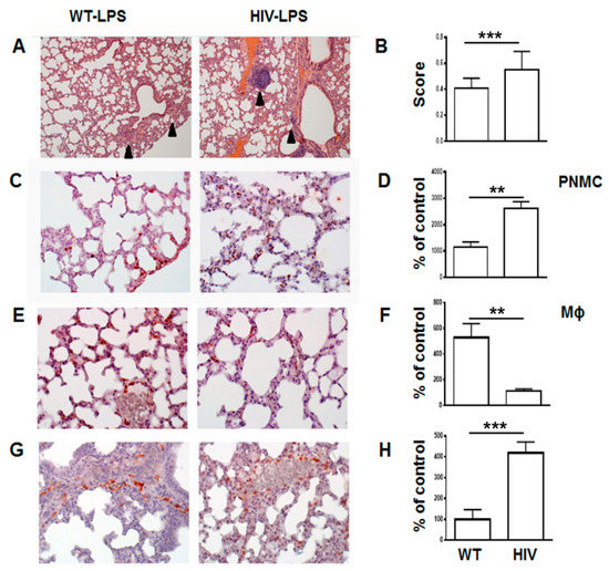 In contrast, at 24 h post LPS administration HIV-Tg mice demonstrated significantly higher levels of lung injury (Figure 2A,B, WT versus HIV, p = 0.0001). Patchy neutrophilic infiltrates and thickening alveolar walls with interstitial neutrophils were more prominent in HIV-Tg mice compared to WT mice (Figure 2A, arrowheads). Immunostaining of neutrophils demonstrated over two-fold increased accumulation in LPS-injected HIV-Tg animals compared to LPS-injected WT mice (Figure 2C,D, red color, WT versus HIV-Tg PNMC, p = 0.0051). Levels of lung neutrophils and macrophages were similar in control groups of WT and HIV-Tg mice injected with PBS (Supplemental Figure A2A,B, PBS injected WT versus for HIV-Tg PNMC, p = 0.5476; for Mϕ, p = 0.6018). Injection of LPS stimulated significant interstitial lung macrophage infiltration in WT mice (Figure 2E,F, red staining). In contrast, in LPS-injected HIV-Tg mice there were much less infiltrated interstitial macrophages compared to WT mice (Figure 2E,F, WT versus HIV-Tg, red staining, p = 0.0057).