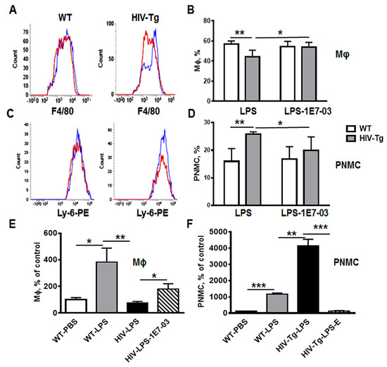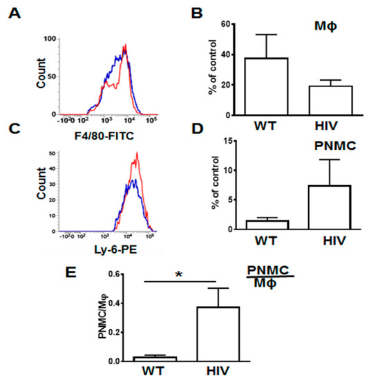 To quantify lung infiltrating leukocytes, we isolated them as described in Materials and Methods and analyzed by FACS (Figure 3 and Supplemental Figure A3). The gate strategy for neutrophils and macrophages isolated from HIV-Tg and WT mice is shown in Supplemental Figure A3. In LPS-injected HIV-Tg mice, levels of lung infiltrated macrophages were reduced (Figure 3A, F4/80-FITC blue color—WT, red color—HIV-Tg, and quantification in Figure 3B) but levels of lung infiltrated neutrophils were increased (Figure 3C, Ly-6G-PE blue color—WT, red color—HIV-Tg, and quantification in Figure 3D) at 24 h post injection. Correspondingly, the neutrophil/macrophage ratios were significantly higher in HIV-Tg mice compared to WT mice (Figure 3E, p = 0.018).