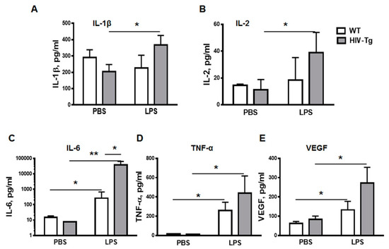LPS-induced systemic pro-inflammatory cytokines in WT and HIV-Tg mice. Levels of circulating cytokines were measured by multiplex suspension array at 24 h after PBS and LPS administration. (A) IL-1β, (B) IL-2, (C) IL-6, (D) TNF-α. (E) Levels of circulating VEGF were measured by enzyme-linked immunosorbent assay (ELISA). Asterisks indicate: * p < 0.05 and ** p < 0.01.