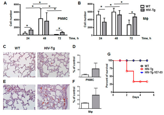 The cell number of neutrophils significantly increased between 24 and 48 h in both mouse strains (Figure 5A, WT 24 h versus 48 h, p = 0.011; and HIV-Tg 24 h versus 48 h, p = 0.046). Macrophage lung infiltration was also significant in both strains, but it had different kinetics for WT and HIV-Tg mice (Figure 5B). While for WT mice, macrophages infiltration peaked at 24 h and was significantly reduced at 72 h, in HIV-Tg mice, the infiltration was delayed, with the peak at 48 h and little reduction at 72 h (Figure 5B). Therefore, both neutrophil and macrophage infiltrations were significantly reduced at 72 h in WT mice (Figure 5A, compare WT at 48 h and 72 h, p = 0.015; and Figure 5B, compare WT at 48 h and 72 h, p = 0.016). In contrast, in HIV-Tg mice neutrophil levels were significantly reduced at 72 h after LPS administration (Figure 5A, compare HIV-Tg at 48 h and 72 h, p = 0.03), but macrophage levels remained similar at 48 h and 72 h (Figure 5B, compare HIV-Tg at 48 h and 72 h, p = 0.42). Neutrophil levels were persistently elevated at 24 h and 72 h after LPS injections in HIV-Tg mice compared with WT mice (Figure 5A, WT versus HIV-Tg at 24 h, p = 0.012; and 72 h, p = 0.07). Interestingly, macrophage levels were reduced at 24 h and 48 h and increased at 72 h in HIV-Tg mice compared to WT mice (Figure 5B, WT versus HIV-Tg). Lung immunostaining also demonstrated increased levels of neutrophil and macrophage accumulation in HIV-Tg mice at 72 h (Figure 5C, PNMC and Figure 5E, Mϕ, red staining) but quantification of lung leukocytes showed no statistical significance, possibly due to the patchy distribution of lung leukocytes (Figure 5D, PNMC, p = 0.1470; and Figure 5F, Mϕ, p=0.1204).