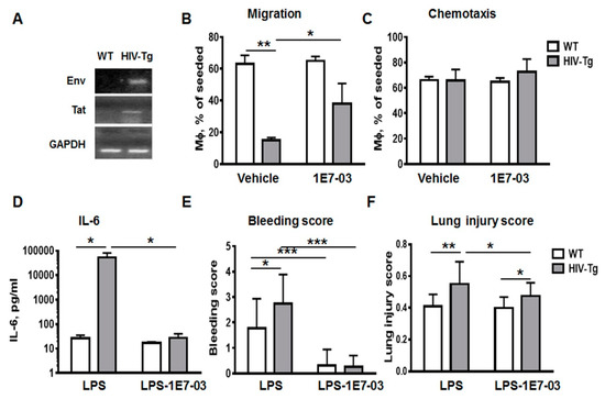 Administration of HIV transcription inhibitor improves migration of macrophages in vitro and reduces lung injury in HIV-Tg mice. (A) Real-time polymerase chain reaction (RT-PCR) for HIV-1 env and tat genes in the peritoneal macrophages isolated from WT and HIV-Tg mice. (B and C) Trans-endothelial migration (B) and chemotaxis (C) of peritoneal macrophages isolated from WT and HIV-Tg mice. 1E7-03 HIV-1 transcriptional inhibitor (1 μM) or 10% dimethyl sulfoxide (DMSO, vehicle) were added to macrophages. (D–F) Administration of 1E7-03 in HIV-Tg mice (1 μg/mg of body weight) significantly reduced levels of circulating IL-6 (C), bleeding score (D) and lung injury score (E). Asterisks indicate: * p < 0.05; ** p < 0.01 and *** p < 0.005.