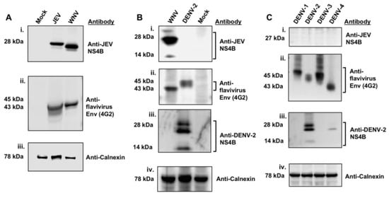 The cross-reactivity of the anti-JEV NS4B antibody procured from GeneTex, Inc. was tested by WB analysis of total protein lysates from Vero cells infected with the Nakayama strain of JEV, the NY99 strain of WNV, and the NGC strain of DENV-2. Infected Vero cells revealed bands of approximately 28- and 27-kDa in sizes in JEV and WNV lysates (Figure 1A-i), respectively, but not in DENV-2 lysate (Figure 1B-i) when probed with JEV NS4B antibody. The 27-kDa band in WNV lysate is consistent with the published data [9,21]. In addition, the 27-kDa protein detected in WNV infected HEK 293 cell lysates, however, was completely undetectable in uninfected control cell lysates at 24 hr after-infection using the anti-JEV NS4B antibody (Supplementary Figure S1B), indicating that the 27-kDa band is the NS4B protein. Since NS4B protein was not detected in the DENV-2 lysate using the anti-JEV NS4B antibody, it is possible that infection of Vero cells was either inefficient or cells were not infected at all. To test this possibility, we incubated the same immobilized membrane with flavivirus 4G2 antibody, a monoclonal antibody that recognizes the E protein of most members of the genus Flavivirus. Expected bands of approximately 43- and 45-kDa in size [22] were detected in WNV and DENV-2 lysates, respectively, (Figure 1B-ii) indicating that the Vero cells were indeed infected with DENV-2. Additionally, the DENV-2 infection of Vero cells was confirmed using an antibody to DENV-2 NS4B protein (Figure 1B-iii). An approximately 78-kDa band corresponding to the host ER-localized protein, calnexin was detected in all lysates (Figure 1A-iii,B-iv) with about the same intensity, demonstrating that the equivalent amount of protein was loaded.