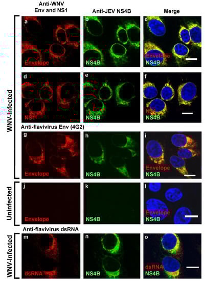 Using an antibody against NS4B protein of JEV, we found that it cross-reacted with the NS4B protein of WNV but not of DENV in all analytical assays we employed. Using high-resolution confocal microscopy on fixed WNV infected cells, the anti-JEV NS4B antibody detected the WNV NS4B protein. Components of the WNV replication complexes, including the replicating double-stranded RNA (dsRNA), the NS1, and E proteins, were localized in the infected cells as demonstrated previously by our group [9].