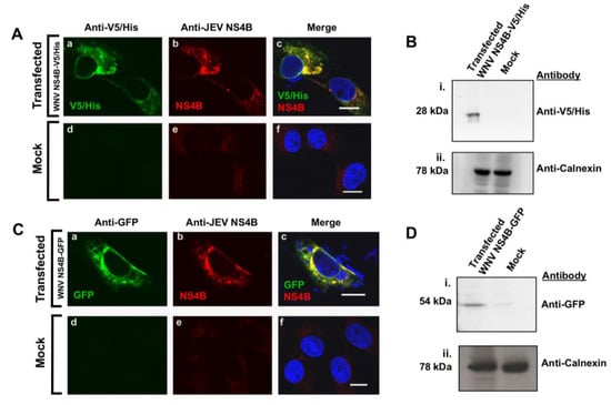 WB analysis was also conducted on the total protein lysates of the transfected cells (Figure 3B,D). The nitrocellulose membrane incubated with anti-V5/His antibody (Figure 3B(i)) or anti-GFP antibody (Figure 3D(i)) revealed the expected sizes of approximately 28 kDa or 52 kDa bands for NS4B-V5/His and NS4B-GFP, respectively. No band was detected in the control cell lysate (Figure 3B(i),D(i)). In these membranes, calnexin was detected in both cell lysates demonstrating that equivalent amount of protein was loaded on the gel (Figure 3B(ii),D(ii)). WB analysis of WNV NS4B-V5/His transfected HEK293 cells also detected NS4B protein by the anti-JEV NS4B antibody, further confirming that this detection was not cell-type specific (Supplementary Figure S2).