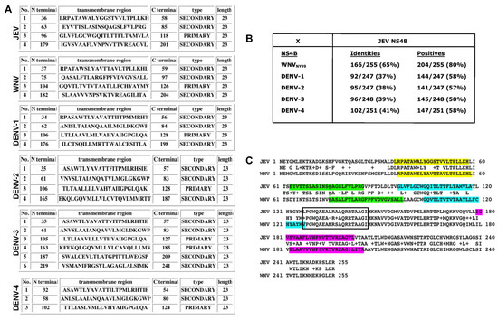 Hydrophobicity and multiple sequence alignment analyses of NS4B of different flaviviruses. (A) Summary of transmembrane prediction results generated by the SOSUI program showing the number, positions, residues, length, and type of each of the transmembrane helices. (B) Alignment summary scores after multiple sequence alignment of NS4B proteins of WNV and four serotypes of dengue against JEV using ClustalW2 program. (C) Complete NS4B amino acid alignments of the WNV NY99 and JEV Nakayama strains. Highlighted residues in different colors depict the predicted location of the four transmembrane helices. The boxed region depicts the highly conserved region among flaviviruses. Virus abbreviations and (Genbank accession number): DENV-1: Dengue 1 (EU848545.1); DENV-2: Dengue 2 (EF457904.1); DENV-3: Dengue 3 (M93130.1); DENV-4: Dengue 4 (AY947539.1); WNV: West Nile virus NY99 strain (YP_001527886); JEV: Japanese encephalitis (NP_775673).
