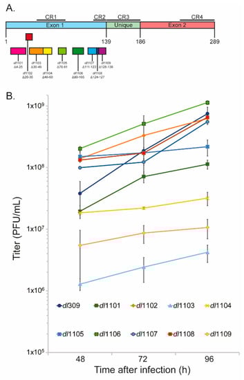 The E1A gene of HAdV5 encodes for five different splice variants that range in length from 289 amino acids found in the largest 13S mRNA-encoded splice variant, to 55 residues found in the smallest 9S mRNA-encoded protein []. The dynamics of these mRNAs, and consequently the proteins that are translated from them, vary substantially during the course of viral infection. Specifically, the two largest HAdV5 E1A isoforms (289R and 243R) are found predominantly early in the infection []. As the infection progresses, the smaller isoforms become more abundant, with the 10S-derived 171R protein becoming the most abundant detectable variant, while the two largest variants express at decreasing levels []. Interestingly, the differences between these isoforms and their relative contribution to viral infection have not been thoroughly studied. Surprisingly, neither has the contribution of the E1A regions outside of the conserved regions been thoroughly investigated in the context of viral fitness. We have recently used the dl1100 series of E1A mutants within the second exon of the protein to establish how these mutations affect overall viral replicative cycle [], with surprising findings. For example, all E1A C-terminus mutants were deficient in growth, induction of S-phase, viral protein and gene expression, and their ability to replicate their genomes. Importantly, the mutants affected were not only the ones that deleted portions of the conserved region (CR) 4, but also those that deleted the inter-CR residues of the protein thought to play a less critical role in the viral life cycle []. These observations hinted at a potential important function of the regions outside of the CRs in viral replication and life cycle. We therefore hypothesized that we would see similar effects in deletion mutants within the first exon of E1A outside of the CRs.