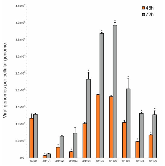 Deletions within the first exon of E1A affect a wide variety of both viral and cellular processes that can influence viral replication. One key process is the induction of S-phase in the infected cell that directly impacts the ability of the virus to replicate its genome, other effects will directly affect expression of viral proteins necessary for genome replication, such as the DNA polymerase. We therefore investigated how the deletions within the first exon of E1A affect the ability of the virus to replicate its genome (Figure 4). Replication of viral genomes was assessed at 48 and 72 h after infection. This represents a time after the onset of genome replication, which we have previously established to occur at approximately 30 h after infection, in primary arrested lung fibroblasts []. Several of the mutants studied showed severe deficiencies in their ability to replicate their genomes, including dl1101, dl1102, and dl1103. These mutants showed deficiencies at all times analyzed. Other mutants showed more moderate defects, especially at 48 h after infection, including dl1108 and dl1109. Interestingly, some mutants replicated their genomes more efficiently than the virus expressing wt E1A and these were mutants dl1105 and dl1106. Overall, our results show that deletions at the extreme 5’ end of the first exon of E1A (N-terminus and CR1 of the protein) have the most dramatic effect on viral genome replication followed by mutants within CR2, while deletions in the inter-CR region appear to enhance genome replication particularly at late times in infection.