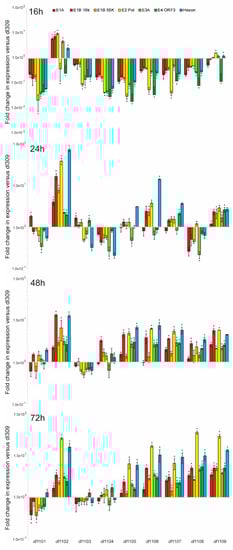 E1A is central to the regulation of expression of all viral genes after infection and it is found on all viral promoters during the course of infection [,]. We therefore investigated how the effects of the deletions within the first exon of E1A affect its ability to transactivate and regulate viral promoters. We examined viral gene expression at 16, 24, 48, and 72 h after infection and compared it to the expression of these genes from cells infected with dl309, expressing wt E1A (Figure 5). Early in infection, at 16 h, all viruses showed viral gene expression that was lower than that observed in dl309-infected cells with the exception of mutants dl1102 that showed most genes being slightly higher and dl1109 that showed similar gene expression to dl309. This trend continued at 24 h after infection, although at this time-point we observed smaller differences with the mutants that were deficient as compared to dl309, with some mutants now having higher gene expression of some but not all genes. In particular, mutant dl1106 showed elevated gene expression of the late gene as well as the viral DNA polymerase. At 48 h after infection we observed that most mutants, with the exception of dl1101, dl1103, and dl1104, showed viral genes to be modestly upregulated as compared to dl309 and this trend was also observed at 72 h after infection.