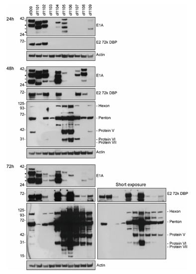 We also investigated how E1A deletions affect viral protein expression (Figure 6). We observed highly variable E1A levels between the different mutants at all times during infection, with some mutants having very low or undetectable levels of the protein, particularly at the earlier time points. Interestingly, the levels of E1A mRNA did not necessarily correlate with that of the observed protein. For example, levels of E1A mRNA were approximately 5-fold higher in dl1108 and dl1109 mutants than those in dl309 at 72 h after infection yet the E1A protein levels were much lower. Intriguingly, we also observed substantial variability in the stoichiometry of different E1A isoforms across the mutants. This was particularly apparent with dl1105 that expressed nearly equal levels of the four detectable E1A proteins at 24 h after infection, while later expressing only the 12S and 10S-derived polypeptides. Nevertheless, the 10S-derived 171R and equivalent mutant variants was generally the most abundant E1A isoform detectable later in infection, as we have observed before [,]. Generally, levels of the 72kDa DNA binding protein (DBP) correlated with the levels of E1A, but did not correlate with viral genome replication. Whereas the levels of late and structural proteins did not correlate with E1A or DBP levels, but rather followed the pattern of viral genome replication. Interestingly, the concentrations of structural proteins did not directly correlate with growth, as, for example, the mutant dl1102 had lower protein levels than dl309 yet was capable of similar growth. We did not detect any late proteins at 24 h after infection in all infected samples (not shown). In summary, our results show dramatic differences between viral gene and protein expression across the different mutants of E1A.