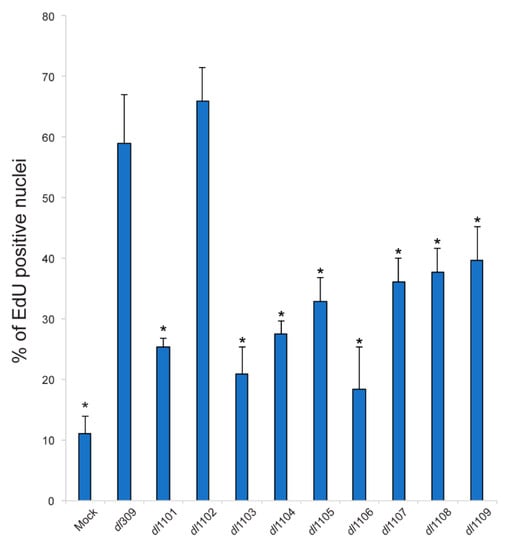 HAdV relies heavily on the host cell to replicate, requiring the infected cells to efficiently enter the S-phase in order to enable viral genome replication []. We therefore investigated the ability of the virus to drive the infected cells into S-phase (Figure 7) and its ability to deregulate expression of a small set of S-phase specific genes, required for cellular genome replication (Figure 8). All mutant viruses, with the exception of dl1102, were deficient for induction of S-phase as compared to dl309. Interestingly, all viruses were capable of driving cells into S-phase as compared to arrested cells that were mock-infected. Surprisingly, viral mutants that are unable to bind to the Retinoblastoma (pRb) family of proteins were still relatively adept at driving S-phase (mutants dl1107 and dl1108) in arrested cells. The ability of the different mutant viruses to replicate was not correlated with their ability to drive the S-phase, neither was the overall viral genome replication. For example, the mutant dl1106 was quite poor at driving S-phase at 24 h after infection but was one of the better viruses in terms of its growth and capacity to replicate its genomes. In fact, it was similar in those two aspects to dl1101, which grew poorly and was severely deficient for its ability to replicate its genomes. In the end, most mutants showed differences and deficits in their ability to drive S-phase but this had little correlation to the ability of the virus to replicate.