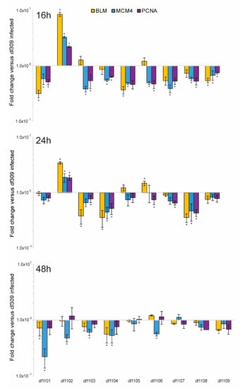 The ability of the virus to replicate its genome is more likely due to the cell cycle state of the cell rather than the virus itself. We therefore investigated the ability of the mutants to deregulate a set of cellular S-phase specific genes (Figure 8). Overall, most viruses with the exception of dl1102 were deficient, as compared to dl309, at early time points in their ability to induce expression of MCM4, BLM, and PCNA. This deficit largely continued at 24 h but some viruses were approaching expression levels observed in dl309-infected cells, including dl1101, dl1105, dl1106, and dl1109. After 48 h, we observed little difference between the expression of cellular genes in the mutant-infected cells and those infected with dl309 expressing wt E1A. In conclusion, our results show that the most pronounced defects were observed early in infection and—as the infection progressed—both viral and cellular genes were able to equalize or surpass expression levels observed in dl309-infected cells.