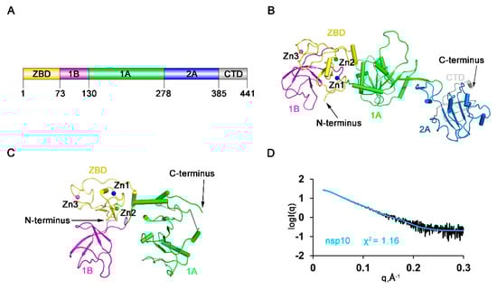Overall structures of the full-length highly pathogenic porcine reproductive and respiratory syndrome virus (HP-PRRSV) nonstructural protein 10 (nsp10) and a truncated form. (A) Domain organization of PRRSV nsp10. PRRSV nsp10 contains an N-terminal zinc-binding domain (ZBD) (yellow), domain 1B (purple), two RecA-like domains 1A (green) and 2A (blue), and a C-terminal domain (CTD) (grey). Structures of (B) full-length nsp10 and (C) a truncated form lacking domains 2A and CTD. (D) Comparison of the calculated scattering profiles of nsp10 structure with small-angle X-ray scattering (SAXS) experimental data. Experimental data are represented in black.