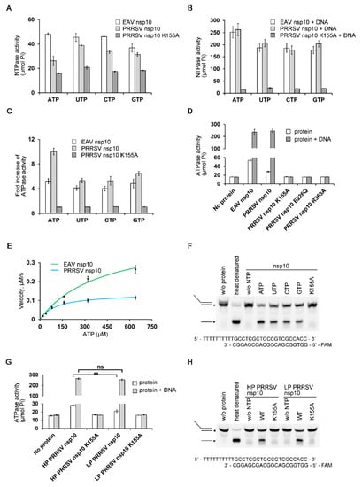 The following are available online at https://www.mdpi.com/1999-4915/12/2/215/s1, Figure S1: Structural comparisons of methylated nsp10, truncated nsp10, PRRSV nsp10, and EAV nsp10. Figure S2: ATPase activities of PRRSV nsp10 and EAV nsp10 were determined from Lineweaver-Burk plots of hydrolysis activity using the malachite green assay. Figure S3: Structural characterization of the PRRSV nsp10 ZBD. Figure S4: Putative protein interaction surface of the nsp10 ZBD. Figure S5: Validation of the nucleic acid binding ability of PRRSV nsp10. Figure S6: Structural comparison of PRRSV nsp10-DNA complex and holo PRRSV nsp10. Figure S7: Comparison of holo nsp10 and complex model with SAXS experimental data of nsp10-DNA complex. Table S1: Pairwise comparison of the isolated ZBD/CH, 1B, 1A/RecA1, 2A/RecA2 and helicase core (1A/RecA1&2A/RecA2) domains of PRRSV nsp10, EAV nsp10 and MERS-CoV nsp13. Table S2: SAXS data collection and analysis. Table S3: Examples of insoluble constructs.