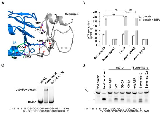 The CTD adopts a novel fold as a search of the PDB using the Dali server revealed no significant similarity to other domains (Figure 4A). The sequence conservation analysis showed that the CTD is poorly conserved among the family Arteriviridae and absent in family Coronaviridae [,]. Since the PRRSV nsp10 structure shows that the CTD is a flexible domain, we then tried to design truncated constructs to find out the role of the CTD in regulating enzymatic activities. We cloned and expressed nine truncated variants that are based on the domain boundary (Table S3). Only one truncated form (residues 1–366) which contained all characteristic SF1 helicase motifs was soluble upon cell lysis. For simplicity, we hereafter referred to this truncated protein as PRRSV nsp10Δ, which was used throughout this study. nsp10Δ could not be expressed in soluble form, lacking the CTD resulted in protein degradation, unless by fusing this truncated protein to SUMO tag. We performed ATP hydrolysis assay, EMSA, and DNA unwinding assay to verify whether nsp10Δ was enzymatically active. The results revealed that nsp10Δ completely abolished ATPase, DNA binding activity, and consequentially also dsDNA unwinding activity (Figure 4B–D). To rule out the possibility that the potential steric clashes between the SUMO tag and PRRSV nsp10 resulted in the deficiencies in the enzymatic activities, we also evaluated the enzymatic activities of Sumo tagged full-length PRRSV nsp10 (Sumo-nsp10). It was found that the enzymatic activity of Sumo-nsp10 was comparable with that of the protein with an authentic N terminus (Figure 4B,D and Figure S5A). Thus, the differences in function between nsp10 and nsp10Δ were more due to the lack of CTD. To find out the role of CTD in regulating the enzymatic activities, we performed a mutagenesis study. The interface area between domain 2A and CTD is 622.2 Å2, mainly contributed by hydrophilic interactions (Figure 4A). For instance, both Lys427 and Arg428 form hydrogen bonds with Asp340, which is a conserved residue of motif Va coupling between NTP and nucleic acid binding sites [,]. The mutant variant D340A displayed reduced ATPase activity (Figure 4B). However, the mutation had no obvious influence on the ATPase activity in the presence of nucleic acid substrate, suggesting that the reduction in ATPase activity caused by the mutation in the interface area between domain 2A and CTD could be offset by the stimulation of nucleic acids. Thus, we speculated that the deficiencies in the enzymatic activities of nsp10Δ might be due to a misfolded protein, rather than due to lack of a critical domain. Taken together, these results suggest that CTD may stabilize the fold of nsp10 and regulate enzymatic activities.