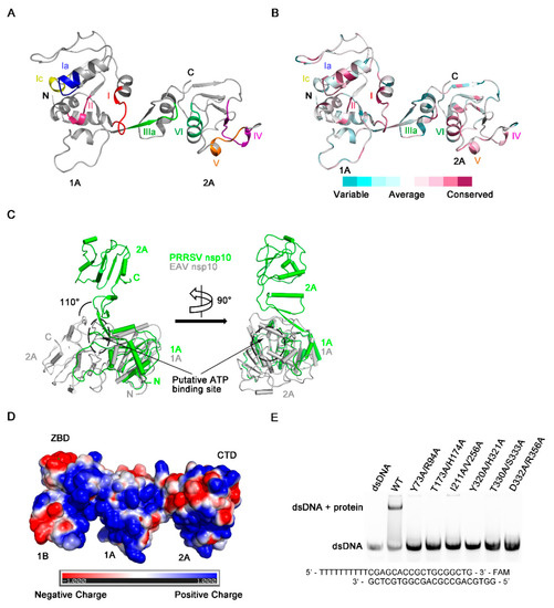 Regions critical for enzymatic activities. (A) Position of conserved motifs necessary for NTP binding, hydrolysis and nucleotide binding in the structure of the PRRSV nsp10 helicase core. (B) The helicase core was colored by conservation calculated using Consurf [] based on multiple sequence alignment of PRRSV nsp10, EAV nsp10, MERS-CoV nsp13, severe acute respiratory syndrome coronavirus nsp13, and lactate dehydrogenase-elevating virus nsp10 [,,,,,]. (C) Structural comparison of the helicase core of PRRSV nsp10 and EAV nsp10 reveals differences in structural rearrangements. These two structures are superimposed on 1A domains. The putative ATP binding site is shown as a dotted circle. A 90° rotation view is shown in the right panel. (D) Overview of surface charges of PRRSV nsp10. (E) The binding abilities of PRRSV nsp10 mutants to dsDNA are demonstrated through EMSA.