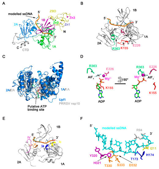 Model of PRRSV nsp10-DNA complex. (A) Model of PRRSV nsp10-DNA complex was generated based on the structure of EAV nsp10-DNA complex. The rest part of ssDNA is omitted for clarity. Domain colors are the same as in Figure 1A. (B) Position of conserved motifs and key residues necessary for NTP binding and hydrolysis in the structure of the nsp10-DNA complex model. (C) Superposition between helicase cores of human Upf1-ADP-AlF4- (PDB ID: 2XZO) in marine and PRRSV nsp10-DNA complex model in grey. These two structures are superimposed on 2A domains. (D) Close-up view of the modelled ADP-AlF4- with the residues of PRRSV nsp10, which involved in NTP binding and hydrolysis. A 90° rotation view is shown in the right panel. Motifs colors are the same as in Figure 5A. (E) Position of conserved motifs necessary for nucleotide binding in the structure of the nsp10-DNA complex model. The ZBD, the CTD, and the rest part of ssDNA in the complex model are omitted for clarity. (F) Close-up view of the modelled nucleic acids with the residues involved in nucleic acids’ binding. Motifs colors are the same as in Figure 5A.