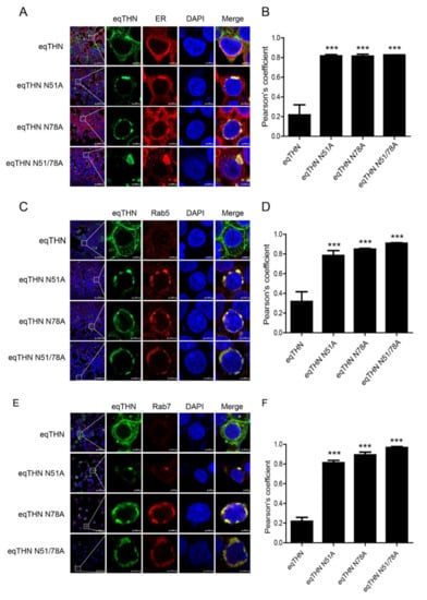 N-glycosylation modification mediates the normal trafficking of eqTHN in cells. HEK293T cells transfected with 1 μg of plasmids expressing eqTHN or its N-glycosylation mutants were investigated using confocal microscopy: blue, cell nucleus; green, eqTHN protein tagged with FLAG; red, KDEL for the endoplasmic reticulum (A), Rab 5 for early endosomes (C), Rab 7 for late endosomes (E) and cd63 and LAMP1 for lysosomes (G,I). Pearson correlation coefficient values for the colocalization of eqTHN and ER (B), early endosomes (D), late endosomes (F) and lysosomes (H,J). Error bars from three independent experiments. ***, p < 0.001; **, p < 0.01; *, p < 0.05; ns, not significant.