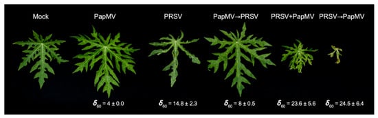 Leaves of mock-inoculated and virus-infected plants showing symptoms at 60 days post infection (dpi) with damage values (δ60). Single infections of PapMV (Papaya mosaic virus), PRSV (Papaya ringspot virus), stepwise infection of PapMV→PRSV resulting in antagonism, stepwise infection of PRSV→PapMV, and co-inoculation of PRSV with PapMV, resulting in synergism.