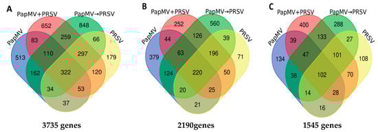 Differentially expressed genes (DEGs) on a Venn diagram for the single infections of PapMV and PRSV, and the stepwise infections of PapMV→PRSV (antagonism) and PapMV + PRSV (synergism). PapMV→PRSV (green), PapMV + PRSV (red), PapMV (blue), and PRSV (yellow). (A) Total DEGs (up- and downregulated). (B) Upregulated genes with ≥1.5 b (foldchange-like) values. (C) Downregulated genes with ≤−1.5 b (foldchange-like) values.