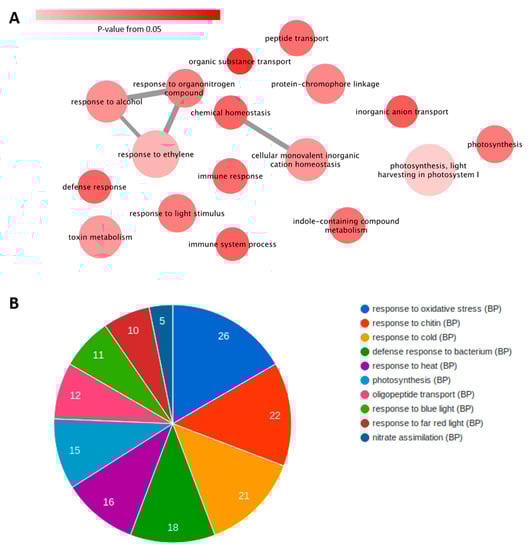 The coding sequence (CDS) of each gene and transcript was annotated using TransDecoder []. Differentially expressed genes (DEGs) were annotated based on top-BLASTx-hit similarity searches against The Arabidopsis Information Resource (TAIR 10) and SwissProt databases under a threshold e-value ≤ 1 × 105. Each DEG was functionally classified and functionally annotated based on eggNOG with a Gene Ontology (GO) classification source in terms of their biological processes (BP), molecular function (MF), and cellular component (CC) using the AgriGO analysis tool [,].
