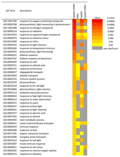 Color map of the cross-comparison of single enrichment analysis (SEACOMPARE). Color scale represents the significance level of ontology (BPs), for each condition. The figure only depicts those Gene Ontology (GO) terms that met the criteria of low redundancy OR present in the network unique for antagonism (PapMV→PRSV) OR shared with other conditions AND significant for PapMV→PRSV.